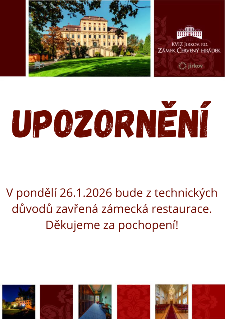 V pondělí 26.1.2026 bude z technických důvodů zavřená zámecká restaurace. Děkujeme za pochopení!