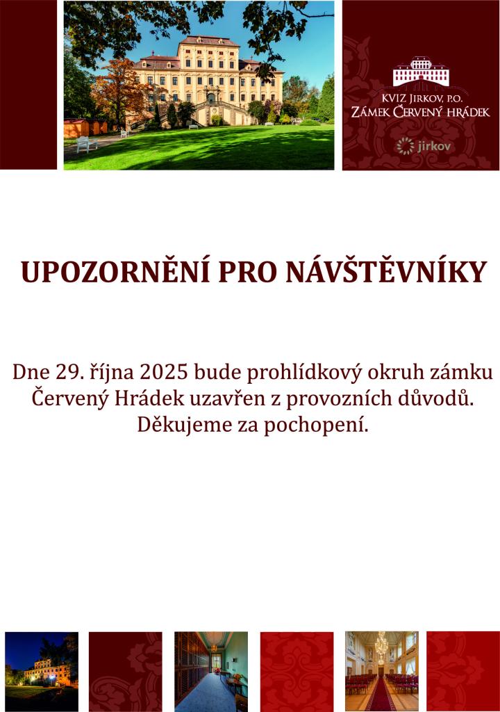 Dne 29. října 2025 bude prohlídkový okruh zámku Červený Hrádek uzavřen z provozních důvodů. Děkujeme za pochopení.