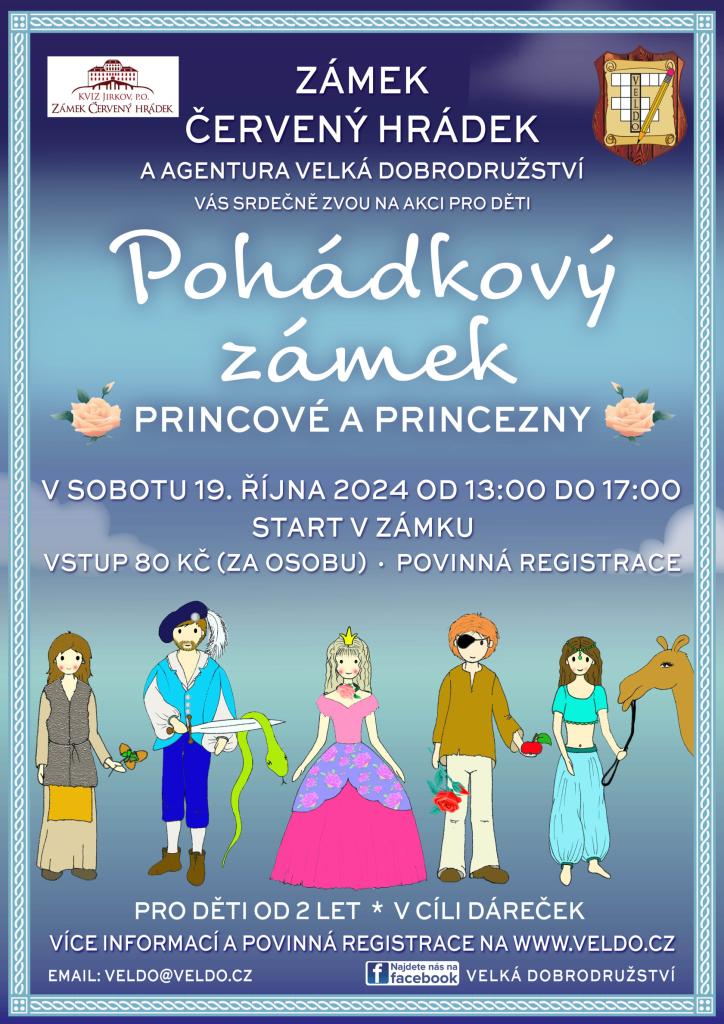 Máte rádi pohádky? Chtěli byste potkat opravdu hodně princů a princezen na jednom místě? Tak to určitě doražte se svými dětmi na pohádkovou akci s názvem Princové a princezny na zámek Červený Hrádek v Jirkově. V sobotu 19.10. na vás v zámku bude čekat Růženka s dorty, Bajaja s drakem, Zubejda s velbloudy, Král Miroslav, princezna Mulan, Třetí princ s hady i Popelka.